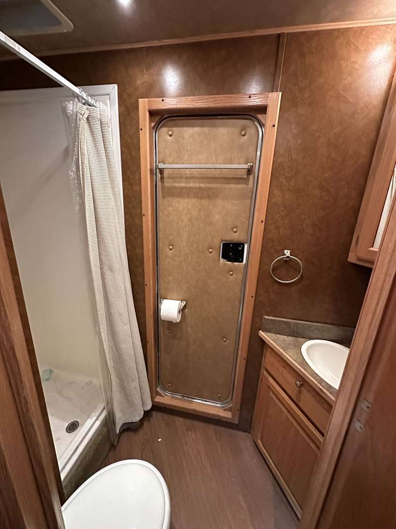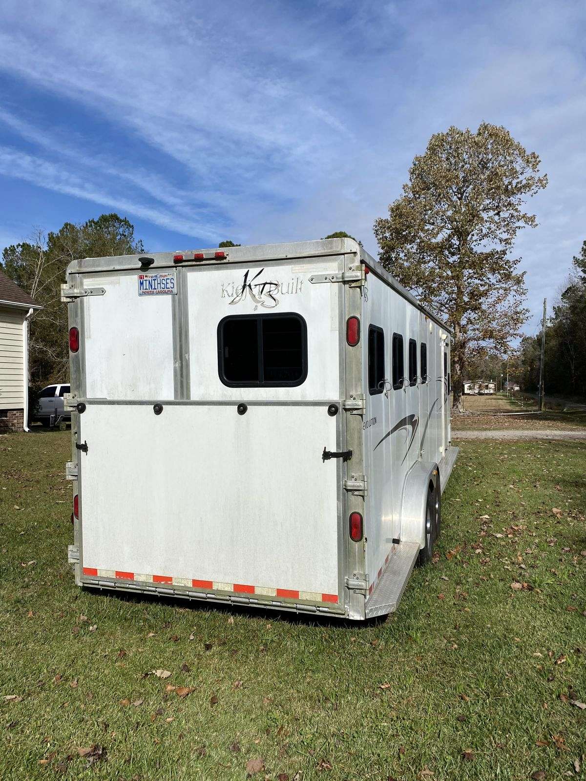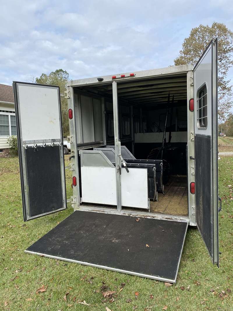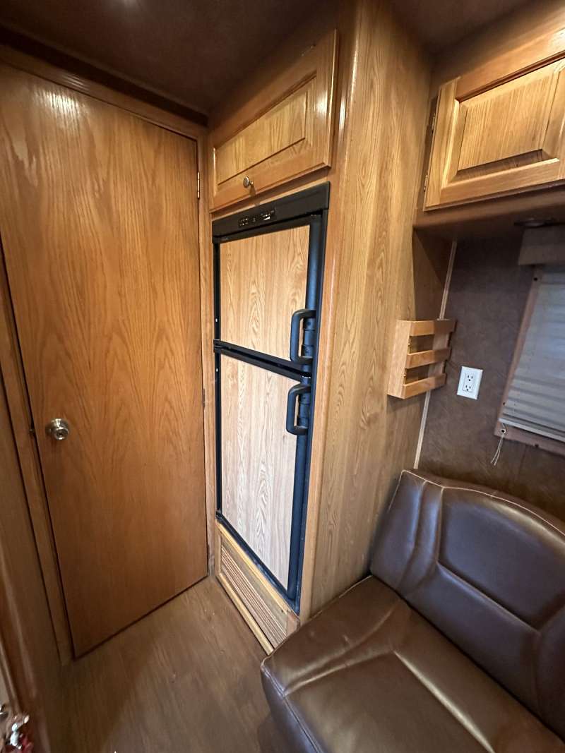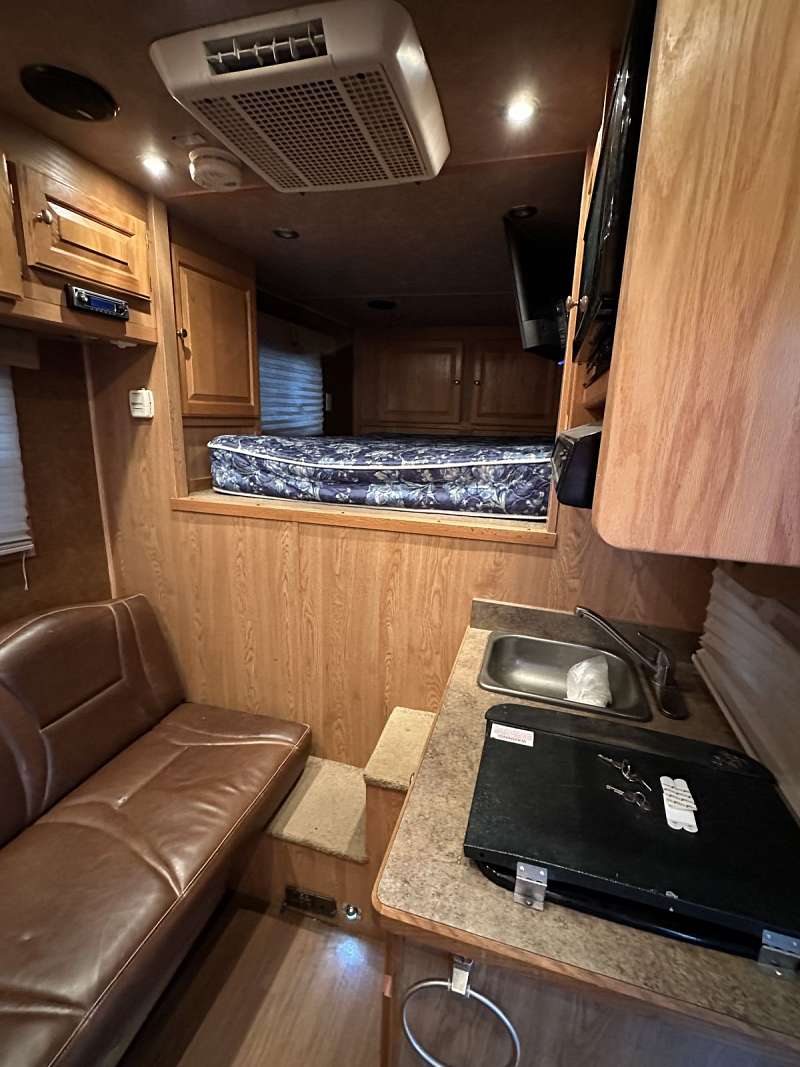Four horse with stud wall and rear collapsing tack. 7’6” tall, 10’ short wall. New TV, tires and speakers. Rumber floors. No awning.